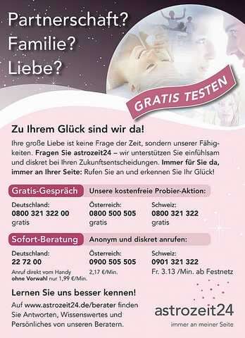 Beschreibung ASTROZEIT24 – immer an meiner Seite Hellsehen Kartenlegen Astrologie Lebensberatung Lernen Sie jetzt in einem kostenlosen Kennenlern-Gespräch astrozeit24 kennen! Werfen Sie einen Blick in Ihre ereignisreiche Zukunft und lassen Sie sich von treffsicheren Hellsehern und Kartenlegern Ihr persönliches Glück voraussagen. Ihr Erstgespräch ist absolut kostenlos und unverbindlich! Seriöse Beratung in allen Lebensfragen gratis und direkt am Telefon, wählen Sie jetzt: 0800 – 321 322 00 Schenken Sie uns Ihr Vertrauen, nutzen Sie Ihr persönliches Kennenlern-Gespräch und öffnen Sie die Türen für neue Glücksmomente! www.astrozeit24.de Wir freuen uns auf Sie! https://plus.google.com/109599794538946594684/about http://www.facebook.com/www.astrozeit24.de/info https://www.twitter.com/astrozeit24 http://www.astrozeit24.blogspot.de/ http://www.youtube.com/user/astrozeit24DE http://www.myspace.com/astrozeit24.de http://www.metacafe.com/watch/9156024/gratis_tarot_hellsehen_kartenlegen_wahrsagen_www_astrozeit24_de/ http://www.clipfish.de/video/3845453/astrozeit24-deutschland-kartenlegen-hellsehen-wahrsagen-tarot-astro-lebensberatung/ http://www.myvideo.de/mitglieder/astrozeit24DE https://www.picasaweb.google.com/109599794538946594684