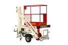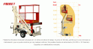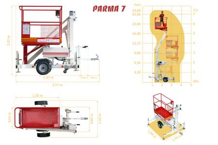 Beschreibung Mobile gegliederte Arbeitsbühne mit 7.5 Metern Arbeitshöhe. Ihr Gewicht von 450 kg ermöglicht, dass keine Abstützung notwendig ist und dass sie mit fast jedem Fahrzeug transportiert werden kann. Zwei mögliche Spannungsquellen (AC 220V oder 12V Batterien). Ausgerüstet mit manuellen Stabilisatoren.