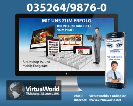 Beschreibung Wir übernehmen kostengünstig und professionell die Realisierung Ihrer Internetpräsenz von der Konzeption bis zum Upload der Dateien auf den Server. Selbstverständlich übernehmen wir auch die Wartung bestehender Webseiten. Besuchen Sie uns auf w w w . v i r t u a w o r l d . n e t oder auf w w w . m a r k e t i n g . v i r t u a w o r l d . n e t ------------------------------------------- Impressum: VirtuaWorld Joachim Bollwerk Riesaer Straße 26 D-01616 Strehla Telefon: 035264/9876-0 Telefax: 035264/98759 e-Mail: virtuaworld@t-online.de -------------------------------------------