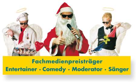 Beschreibung Der Comedy-Spezialist für Ihre Weihnachtsfeier, Firmenweihnachtsfeier, Betriebsweihnachtsfeier! Ihr Comedy-Nikolaus - der Hit für Ihre nächste Betriebsweihnachtsfeier! ... und andere Comedy, Musik, Walking-Act und Showprogramme für Ihre Firmenweihnachtsfeier, Weihnachtsmarkt, Weihnachtsgala, Weihnachtsveranstaltung im Einkaufszentrum, Kaufhaus u.v.m in Frankfurt, Rhein-Main, deutschlandweit und weltweit zu mieten Rick Mayfield bietet vielseitige und professionelle Weihnachtsprogramme - alles aus einer Hand Ihr Spezialist für Betriebsweihnachtsfeier und Weihnachts-Event. Als Ihr Comedy-Weihnachts-Entertainer - Comedy-Kellner und singender Nikolaus- - Comedy-Kellner und singender Nikolaus- singender Santa Claus - wahlweise mit Geschenkeverteilen biete ich Ihnen Deutschlands TOP-Weihnachtsshow mit einem der gefragtesten Sänger hierzulande. Neuere und traditionelle Songs von Have yourself a merry christmas, Happy Day, Blue Christmas, Silver Bells, Santa Claus is coming in town, Sleigh ride, Let it snow, Winter wonderland, White Christmas, Silent night, bis Jingle Bells .............in deutsch und englisch! Weihnachtlich und zugleich fetzig - die lebhafte und bewährte Weihnachtshow mit viel Interaktion mit dem Publikum. Tausende von begeisterten Gästen, Kunden und Fans haben diese Darbietung in Frankfurt und Rhein-Main schon bejubelt. Ich bin Profi für Weihnachtsfeiern in Frankfurt und Rhein-Main. Bei mir mieten Sie verschiedene Musik- und Showprogramme für Ihre Betriebsweihnachtsfeier aus einer Hand. Ihr Weihnachts-Entertainer, Weihnachts-Musiker oder singender Nikolaus für Ihre Firmenweihnachtsfeier in Frankfurt und Rhein-Main mit Musik, Comedy, DJ, Shows. Als Ihr Weihnachts-Walking-Act - optional mit Geschenke verteilen Optional: Walk- & Sitz/Act, Leviten lesen, Geschichten lesen, Modellierballons formen Alle Show-Programme sind einzeln oder in Kombination buchbar: o Comedy: Engel-Empfangs-Kochchef & Engel-Kellner, Tischzauberei, Ballonmodellage o Kombiprogramm: Comedy & Livemusik Party - Tanz - Dinner (Solo - Band), o Shows (Solo) wie singender Nikolaus, Elvis, Sinatra, Schlager u.v.m. o Discjockey mit über 10.000 Weihnachtsliedern und anderen Hits Reservieren Sie jetzt Ihren Wunschtermin - nehmen Sie Kontakt mit mir auf: 0171-51 35 435 Sie suchen einen Top-Weihnachts-Entertainer: o mit einer Weihnachtsshow - Show für Betriebsweihnachtsfeier, Weihnachtsgala, Weihnachtsmarkt, Weihnachtsveranstaltung im Einkaufszentrum, Kaufhaus u.v.m? o der nicht nur Musik darbietet, sondern aus Ihrer Weihnachtsfeier einen unvergesslichen Event entstehen lässt und der perfekte Unterhaltungskünstler für Ihren Event ist? o der Ihre Gäste in Frankfurt und anderswo ausgelassen singen, mitfeiern und viel tanzen lässt? o der noch viel mehr bietet, als nur seine Show zu zeigen? o bei welchem Sie verschiedene Pakete buchen können, alle mit Ihnen persönlich abgestimmt und optimiert? o der Sie gerne persönlich berät und mit Ihnen zusammen das Entertainment plant? o der auf den verschiedensten Veranstaltungen z.B. in Frankfurt, Rhein-Main, BRD und weltweit auftritt? Ihre Gäste sollen lachen? Sehen Sie sich meine Angebote als Ihr Weihnachtsentertainer an! Zur Wahl stehen Animationsprogramme als Empfangschef, Engel-Kellner oder Butler u.a. mit Tischzauberei. Meine Showprogramme für Weihnachtsfeiern lassen sich mit meinem Angebot als Ihr Weihnachts-Entertainer kombinieren! Die vielfältigen Möglichkeiten, das Programm für Ihre Betriebsweihnachtsfeier in Frankfurt und Rhein-Main zu gestalten, werden Sie inspirieren. Kontakten Sie mich: unter 0171-51 35 435 Weitere Infos auf meiner Webseite: http://www.weihnachtsfeier-ideen-frankfurt.de