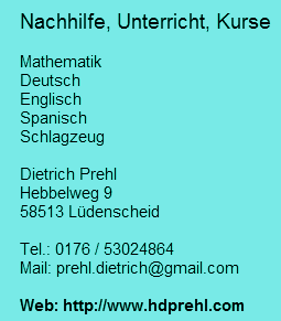 Beschreibung Übersetzungen Spanisch - Englisch, Dahlerbrück, Rechtschreibprüfung und Grammatik, Dahlerbrück, Hilfe bei MS Office, Dahlerbrück, Hilfe bei Excel, Dahlerbrück, Hilfe bei Word, Dahlerbrück, Hilfe bei Texten und Tabellen, Dahlerbrück, Hilfe bei HTML, Dahlerbrück, Nachprüfung, Dahlerbrück, Kurs, Dahlerbrück, Unterricht, Dahlerbrück, Kurse, Dahlerbrück, Hausaufgaben, Dahlerbrück, Betreuung, Sehr geehrte Damen und Herren, hiermit möchte ich Ihnen mein Angebot vorstellen: Nachhilfe Nachhilfe in Mathematik Nachhilfe in Deutsch Nachhilfe in Spanisch Nachhilfe in Englisch Schlagzeugunterricht Deutsch als Fremdsprache Deutsch als Zweitsprache Business-Englisch Business-Spanisch Hilfe bei Referaten Hilfe bei Bewerbungen Hilfe beim Lebenslauf Hilfe bei deutschen Texten Übersetzungen Deutsch – Englisch Übersetzungen Englisch – Deutsch Übersetzungen Deutsch – Spanisch Übersetzungen Spanisch – Deutsch Übersetzungen Englisch – Spanisch Übersetzungen Spanisch - Englisch Rechtschreibprüfung und Grammatik Hilfe bei MS Office Hilfe bei Excel Hilfe bei Word Hilfe bei Texten und Tabellen Hilfe bei HTML Hilfe bei Nachprüfungen Preise als Verhandlungsbasis: Einzelunterricht: 14 EUR pro 60 Minuten Unterricht zu zweit: 8 EUR pro 60 Minuten (pro Person) Unterricht zu dritt: 6 EUR pro 60 Minuten (pro Person) Unterricht zu viert: 5 EUR pro 60 Minuten (pro Person) Mit freundlichem Gruß Dietrich Prehl Nachhilfe, Unterricht, Kurse Dietrich Prehl Hebbelweg 9 58513 Lüdenscheid Tel.: 0176 / 53024864 Webseite: http://www.hdprehl.com Spanisch, Altena, Nachhilfe in Englisch, Altena, Schlagzeugunterricht, Altena, Deutsch als Fremdsprache, Altena, Deutsch als Zweitsprache, Altena, Business-Englisch, Altena, Business-Spanisch, Altena, Hilfe bei Referaten, Altena, Hilfe bei Bewerbungen, Altena, Hilfe beim Lebenslauf, Altena, Hilfe bei deutschen Texten, Altena, Übersetzungen Deutsch – Englisch, Altena, Übersetzungen Englisch – Deutsch, Altena, Übersetzungen Deutsch – Spanisch, Altena, Übersetzungen Spanisch – Deutsch, Altena, Übersetzungen Englisch – Spanisch, Altena, Übersetzungen Spanisch - Englisch, Altena, Rechtschreibprüfung und Grammatik, Altena, Hilfe bei MS Office, Altena, Hilfe bei Excel, Altena, Hilfe bei Word, Altena, Hilfe bei Texten und Tabellen, Altena, Hilfe bei HTML, Altena, Nachprüfung, Altena Kurs, Altena, Unterricht, Altena, Kurse, Altena, Hausaufgaben, Altena, Betreuung,