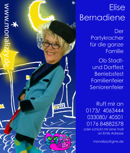Beschreibung "Elise wees bescheid" Die perfekte witzige und lustige Showeinlage für Ihre Familienfeier, Ihr Betriebsfest, Dorffest, Erntefest, Ihrer Frauentagsparty und viels mehr. ein witziges Unterhaltungsprogramm über "Ihm & Ihr" und andere unwichtige Dinge im Leben, mit viel Herz und großer Klappe jequasselt und gesungen von Elise Bernadiene. Die stimmungsvollen Lieder aus eigener Feder oder Lieder von Helga Hahnemann u.v.m. sind auch über die Grenzen Berlins bekannt und auch ohne Gesangstalent von Jedem leicht mitzusingen. Der Humor geht stets auf die "eigene Kappe", Niemand wird vorgeführt und alles bleibt "oberhalb der Gürtellinie". Der Auftritt ist technisch umaufwändig und benötigt keine großartigen Vorbereitungen. Kontakt und mehr Infos unter : www.monalizzy.de oder ganz persönlich unter: 03308040501 oder 01734063444 Videos: https://www.youtube.com/watch?v=V1LjFEZKZ7I https://www.youtube.com/watch?v=7xnLSHVFpXg https://www.youtube.com/watch?v=S-x3M4r0ksk&t=3s