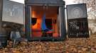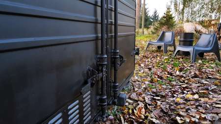 Es wurde ein alter Versandbehälter verwendet, der geschnitten, geschweißt und gestrichen worden war.