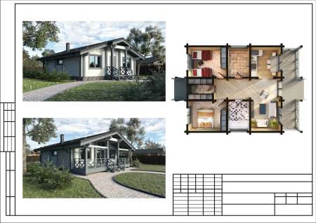 Beschreibung Ein Holzhaus aus Furnierschichtholz mit Terrasse "Wolfgang" ist ein kleines Haus für den ständigen Wohnsitz einer kleinen Familie. Das Haus hat alles was Sie brauchen: zwei Schlafzimmer, ein Badezimmer und eine geräumige Wohnküche. HAUS-PLAN: