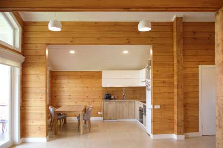 Die Einheit mit der Natur wurde zum Leitmotiv des Projekts dieses Hauses aus Leimholz. Unser Architekt hat das Gebäude fein in die bestehende Bebauung aus Gassilikat eingesetzt, die Vorteile des Holzes positiv betont und die Aufmerksamkeit auf das gebaute Haus herangezogen.