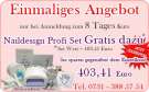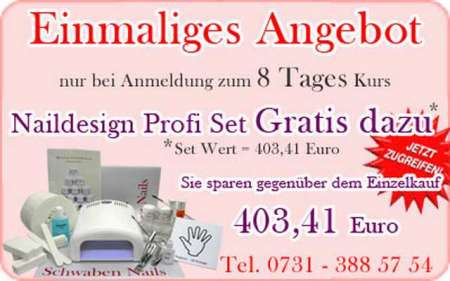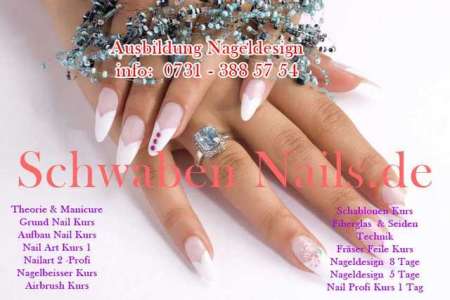 Beschreibung In unseren Schulungen für Nageldesign werden Sie von professionellen, geprüften Nageldesignerinnen ausgebildet. Unsere Seminare finden immer nur in kleinen Gruppen statt, damit Sie intensiv sowohl alle theoretischen, als auch die praktischen Inhalte erlernen können. Selbstverständlich erhalten Sie für jede Schulung ein Zertifikat. Fordern Sie noch heute kostenlos und unverbindlich Ihre Schulungsunterlagen bei uns an unter: http://www.schwabennails.de/Schulungsunterlagen_anfordern.phtml Folgende Kurse bieten wir Ihnen an: - Theorie / Manicure - Grundschulung - Aufbauschulung - Nailartschulung - Modellage bei Nagelbeißern - Schablonentechnik - Arbeiten mit der elektrischen Feile - Airbrushseminar - Fiberglas / Seidentechnik - Nailart II Seminar (Geltechnik, Pinselmalerei & One-Stroke) - Profischulung - 5 Tage Professional Seminar - 8 Tage Extended Seminar - Kosmetische Fußpflege - Geltechnik am Fuß Weitere Informationen zu unseren Seminaren und Produkten erhalten Sie unter: www.schwabennails.de oder 0731 - 388 57 54 Shop: www.nagelkosmetik-shop.de Top Angebote: o Bei Buchung des Professional Seminars erhalten Sie einen Tag gratis dazu. Also 6 Tage buchen, nur 5 Tage bezahlen o Bei Buchung des Extended Seminars erhalten Sie ein Profiset im Wert von 403, 41 € gratis dazu. Damit ist Ihre hochwertige Grundausstattung gesichert. Tipp: Nutzen Sie die Chance und beantragen Sie einen Prämiengutschein. Damit können Sie bis zu 500 € der Kurskosten sparen. Schwaben Nails Riedwiesenweg 22 89081 Ulm Tel.: 0731 – 388 57 54 Fax: 0731 – 388 57 56 Inh.: Konstanze Lang E-Mail: info@schwabennails.de www.schwabennails.de www.nagelkosmetik-shop.de |