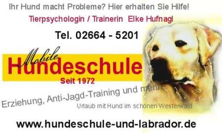 Beschreibung Die Hundeschule und Verhaltenstherapie besteht seit 1972. Inhaberin Elke Hufnagl arbeitet als Tierpsychologin/Trainerin und ist spezialisiert auf die Therapie bei Angst und/oder Aggression. Als Jagdscheininhaberin bildet sie Jagdhunde für den Jagdeinsatz aus; bietet aber auch das "Anti"-Jagd-Training für den Familienhund an. Zu den weiteren Angeboten in Sachen Hundeausbildung gehören: Erziehung (Grundgehorsam), Vorbereitung auf Prüfungen, Apportieren und Beute abgeben, wie auch Abgewöhnen von Unarten u.m. Gruppenkurse und individueller Einzelunterricht innerhalb der Verbandsgemeinde Rennerod, Hausbesuch und Hotelbesuch bei Urlaub bis 30 km Umkreis. Fragen beantworte ich gerne per Telefon.
