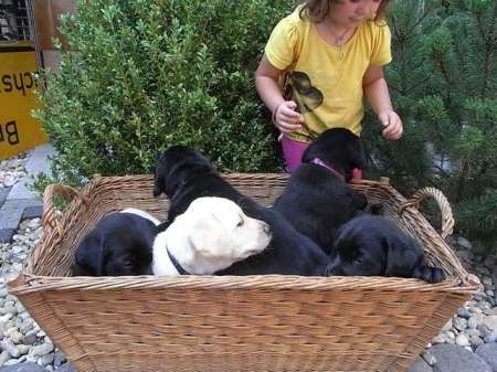 Wir sind 6 zuckersüsse Labrador Welpen! Unsere Mama ist eine junge schwarze Hündin und unser Papa ist ein erfahrener Schoko Rüde die beide natürlich frei von HD, ED und PRA sind. Wir sind zwei Männchen und vier Weibchen fünf von uns sind schwarz und ein Mädchen ist blond. Wir suchen ab Anfang August ein neues Zuhause. Wir sind alle mehrfach entwurmt, einmal geimpft, gechipt und werden bis zum Verkauf unter bester tierärztlicher Versorgung stehen. Wir wachsen in einem sehr familiären Umfeld auf, wir kennen kleine Kinder und alltägliche Geräusche. Wir dürfen aber auch kleinere Ausflüge in die Natur machen. Ihr könnt uns jederzeit in unseren Zuhause besuchen.