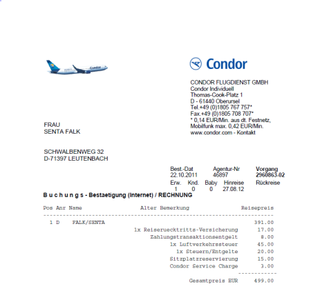 Beschreibung Ich habe leider fehlgebucht und möchte nun meinen Flug loswerden. Der Flug ist ein Langstreckenflug bei Condor. Ich werde die Umbuchungskosten bezahlen und sie können sich dann einen beliebigen Flug (Langstrecke!) in der Sommersaison 2012 (bis Ende Oktober 2012) raussuchen. Der Gutschein hätte einen Wert von 500€, ich verkaufe ihn für 400€ (auf Verhandlungsbasis!). Die 500€ werden dann auf ihre Buchung angerechnet (sprich Hinflug/Hin-und Rückflug, etc. je nach belieben) Bei Interesse oder weiteren Fragen bitte melden! Lg, Senta Falk