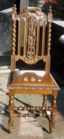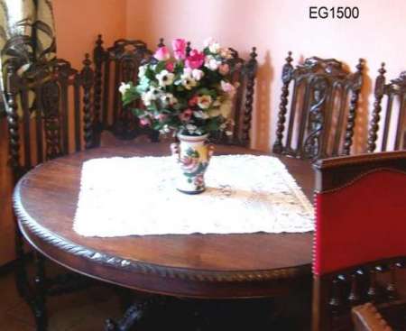 Beschreibung Antike Essgruppe (Jagdzimmer) von ca. 1880. Die faszinierend schönen Schnitzereien sind ein Meisterwerk an Schnitzkunst.. Die Gruppe besteht aus 6 Stühlen (Hochlehner) und einen Esstisch . Der Esstisch ist ebenfalls reichhaltig verschnitzt und ausziehbar bis auf 240 m. Die Essgruppe ist aus massiver Eiche. Weitere Informationen bei http://www.antikblick.com