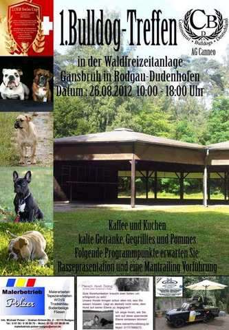 Beschreibung Bulldog-Treffen in der Waldfreizeitanlage „Gänsbrüh" in Rodgau-Dudenhofen des Continental Bulldogs Deutschland e.V. Am Sonntag 26. August 2012 laden wir Sie/Euch herzlich zu unserem Bulldog-Treffen in 63110 Rodgau-Dudenhofen (Rhein-Main-Gebiet) ein. Wir freuen uns auf ein nettes und familiäres Beisammensein unter Bulldogfreunden. Geplant sind Rassepräsentationen und eine Mantrailing-Vorführung. Es gibt genügend Platz für die Hunde zu spielen und zu toben, für Abkühlung sorgt ein kleiner See. Für die Kinder ist ein Spielplatz vorhanden. Natürlich sind auch alle Rasseinteressierte und Bulldogfreunde mit und ohne Hunde herzlich willkommen. Für Speisen und Getränke ist bestens gesorgt! Bitte wg. Kontrolle des Veterinäramtes zu jedem Hund das Impfbuch nicht vergessen! Wenn sich noch jemand am Programm beteiligen möchte, bitte bei uns melden. Anlage und Mikrofone sind vorhanden. Gerne können auch andere Rassepräsentationen stattfinden. Euer Continental Bulldogs Deutschland e.V. — hier: 63110 Rodgau Dudenhofen, Waldfreizeitanlage Gänsbrüh.