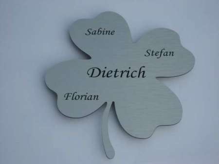 Beschreibung Modernes Türschild in Form eines Kleeblatt aus Edelstahl-Optik. Die Größe des Schildes ist ungefähr 23 x 20 cm. Das Schild hat eine unsichtbare Befestigung auf der Rückseite des Schildes. Sie können sich das Türschild online anschauen und eine Druckprobe anfragen auf namenundmehr.de. Schnelle Lieferung.