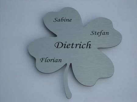 Beschreibung Modernes Türschild in Form eines Kleeblatt aus Edelstahl-Optik. Die Größe des Schildes ist ungefähr 23 x 20 cm. Das Schild hat eine unsichtbare Befestigung auf der Rückseite des Schildes. Sie können sich das Türschild online anschauen und eine Druckprobe anfragen auf namenundmehr.de. Schnelle Lieferung.