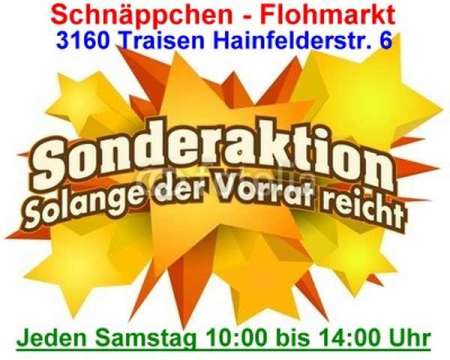 Beschreibung Sonderaktion Jänner Sonderaktionen, aber nur solange der Vorrat reicht und nur gültig im Jänner 2013! Schnapp's Dir! Die Schnäppchen! Sonst sind's weg! Klicken Sie sich auf die Homepage und Informieren Sie sich! http://jaenner-sonderaktion.at.vu Wir freuen uns auf Ihren Besuch! Flohmarkt - Der Schnäppchen - Flohmarkt In 3160 Traisen, Hainfelderstrasse 6, Bezirk Lilienfeld / NÖ / Niederösterreich Jetzt Neu: Jeden Samstag von 10.00 Uhr bis 14.00 Uhr geöffnet. Genaue Lage: 3160 Traisen Hainfelderstrasse 6 ( Neben Hauptschule / Mittelschule - direkt gegenüber Traisen Markt Bahnhofsstation ) Im Bezirk 3180 Lilienfeld / NÖ Flohmarkt in 3160 Traisen Flohmarkt Hainfelderstrasse 6, Traisner Flohmarkt, Flohmarkt in Traisen, Schnäppchen Flohmarkt, Bezirk 3180 Lilienfeld Flohmarkt, St. Pölten Land Umgebung Flohmarkt, nähe 3100 St. Pölten Flohmarkt, Flohmärkte, Schnäppchen, Schnäppchen Flohmarkt, Secondhand, Second hand, Flohmarktsachen, Flohmarktartikeln, Gebrauchtes, Neuwertiges, Antikes, Altes, Trödel, Ramsch, Seltenes, Billig, Günstig, Fast geschenkt, Fundgrube, Flohmarktware, Flohmarktgegenstände, Restposten, Abverkauf, Sonderposten, Sonderpreise, Sonderaktionen, Sonderschnäppchen, Preisschnäppchen, Schnaeppchen Flohmarkt, Flohmarkt in 3160 Traisen, Wochenflohmarkt, Samstags Flohmarkt, Flohmarktartikeln, Seconhandsachen, Flohmarktsachen, Seconhand Artikeln, Gebrauchte Waren, Gebrauchte Sachen, Schnäppchen, Schnaeppchen, Fabrikverkauf, Schnäppchenmarkt, Schnäppchenpreis, Restposten, Handelsplatz für Gebrauchtes, Markt für gebrauchte Waren, Trödelbasar, Verkaufplatz für Trödel, viele diverse Artikel von A - Z, für Damen, Herren und Kinder aus allen Bereichen! http://jaenner-sonderaktion.at.vu