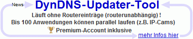 Mit unserem DynDNS Updater Tool können Sie bis zu 100 Anwendungen, wie z.B. IP-Cams, Server, Homeserver, NAS gleichzeitig parallel extern mit einer statischen IP-Adresse (Subdomains) erreichen. Sie benötigen keine Routereinträge mehr, unsere DDNS Software läuft völlig routerunabhängig. Mit der Freischaltung des Dynamic-DNS Update Tools wird Ihr Account auch gleichzeitig auf Premium-Status umgestellt. Die Nutzung des DDNS-Updater-Tools ist zeitlich unlimitiert.