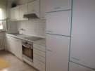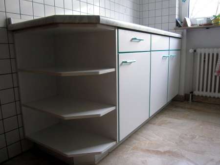 weiss mit türkisfarbiger Umrandung, 1 x 3,90m + Oberschränke, 1 x 1,85m, mit Kühlschrank/separatem Gefrierfach, ohne Herd/Spülmaschine. Gegen Selbstabbau/Abholung.