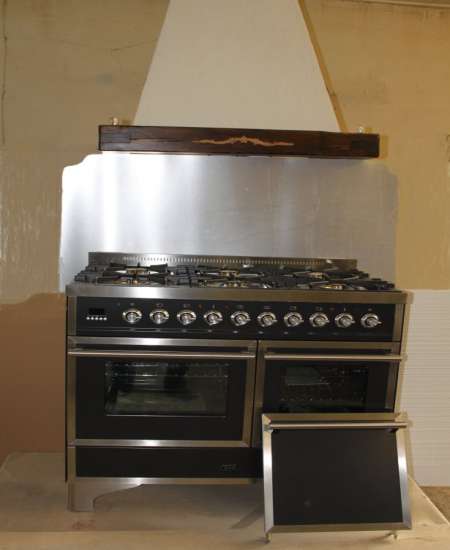 Beschreibung 100 cm breiten Landhausherd NEU mit zwei Backrohren elektrisch und 5 Gas- kochstellen,zusätzlich noch zwei Backofentüren in Reserve incl, der abgebildeten Kaminhaube mit einem alten Massivholbalken.